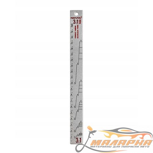 Алюминиевая измерительная линейка, обеспечивающая дозировку правильных пропорций отвердителя и растворителя по отношению к акриловым, базовым лакам и грунтовкам. Измерение с помощью линейки следует проводить в цилиндрическом сосуде.