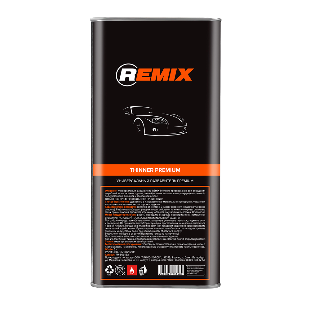 Универсальный разбавитель REMIX PREMIUM предназначен для доведения до рабочей вязкости лаков, грунтов, эмалей (включая металлики и перламутры), на акриловой, полиуретановой, алкидной  и эпоксидной основе.